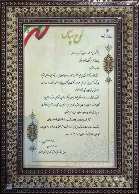 در متن این لوح سپاس که به امضای مهدی جمالی‌نژاد استاندار و رییس ستاد هفته پژوهش و فناوری استان اصفهان رسیده چنین آمده است: