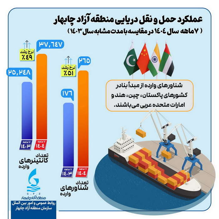 به گزارش گویای خبر به نقل از روابط عمومی سازمان منطقه آزاد چابهار، میزان عملکرد حملونقل دریایی منطقه آزاد چابهار در ۷ ماهه سال ۱۴۰۴ در مقایسه با مدت مشابه ۱۴۰۳؛ در بخش «کانتینرهای وارده» با رشد 49 درصدی از تعداد 25/248 به 37/647 عدد و در بخش «شناورهای وارده» با رشد 51 درصدی از تعداد 176 به 265 عدد رسیده است.