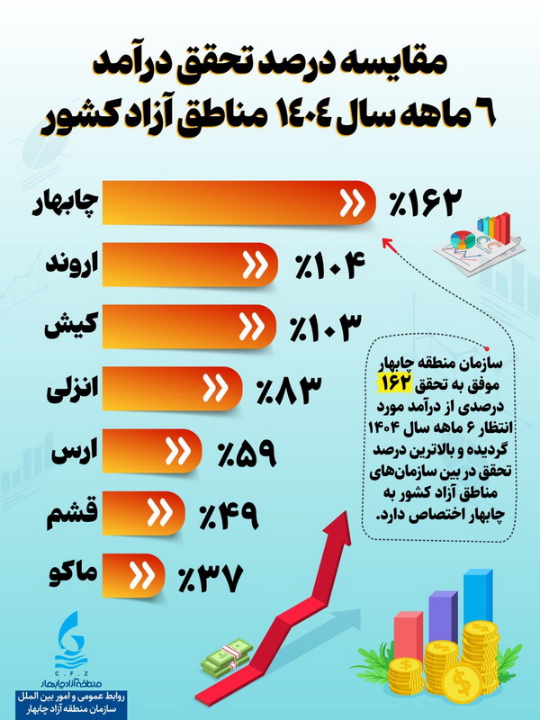 به گزارش گویای خبر به نقل از روابط عمومی سازمان منطقه آزاد چابهار، در گزارش آماری مربوط به درصد تحقق درآمد 6 ماهه اول سال جاری مناطق آزاد کشور، چابهار با 162 درصد بالاترین میزان تحقق درآمدی و اروند با 104 درصد و همچنین کیش با 103 درصد در رتبه‌های بعدی قرار گرفتند.
