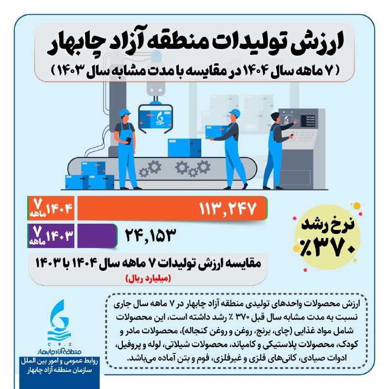 به گزارش گویای خبر به نقل از روابط عمومی سازمان منطقه آزاد چابهار، ارزش محصولات واحدهای تولیدی منطقه آزاد چابهار در ۷ ماهه سال جاری نسبت به مدت مشابه سال قبل ۳۷۰ درصد رشد داشته است. این محصولات شامل مواد غذایی (چای، برنج، روغن و روغن کنجاله)، محصولات مادر و کودک، محصولات پلاستیکی و کامپاند، محصولات شیلاتی، لوله و پروفیل، ادوات صیادی، کانی‌های فلزی و غیرفلزی، فوم و بتن آماده می‌باشد.