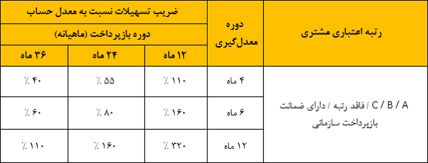 شایان ذکر است، دوره معدلگیری این تسهیلات از 4 تا 12 ماه و دوره بازپرداخت آن از 1 تا 3 سال تعیین شده و امتیاز آن برای اشخاص حقیقی قابل انتقال به نزدیکان شامل همسر، فرزندان، والدین، برادر و خواهر و برای اشخاص حقوقی قابل انتقال به پرسنل بیمهشده که حقوق آنها از طریق بانک ملت واریز می شود، است.