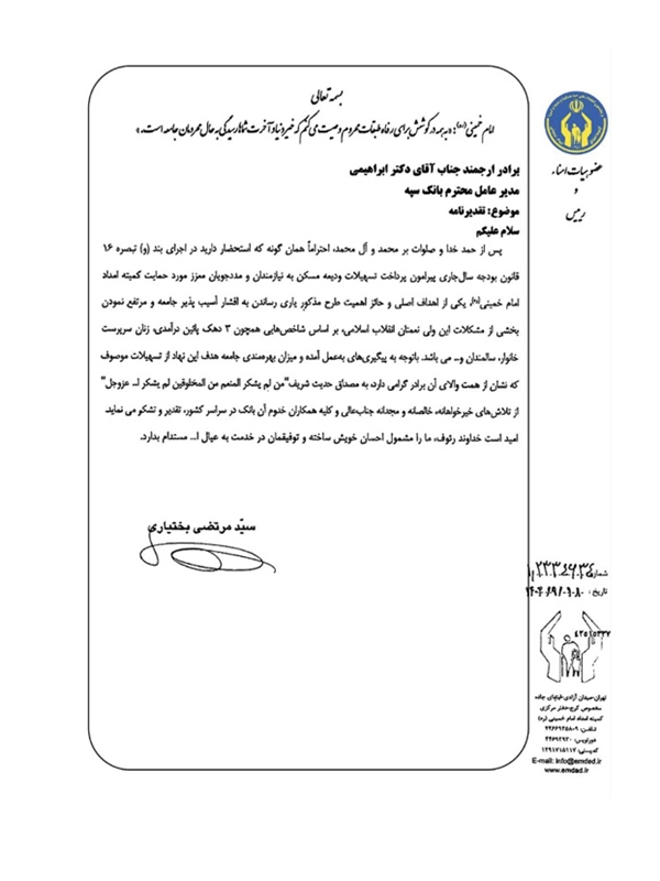 احتراما همان‌گونه که استحضار دارید در اجرای بند (و) تبصره ۱۶ قانون بودجه سال جاری پیرامون پرداخت تسهیلات ودیعه مسکن به نیازمندان و مددجویان معزز مورد حمایت کمیته امداد امام خمینی (ره)، یکی از اهداف اصلی و حائز اهمیت طرح مذکور یاری رساندن به اقشار آسیب پذیر جامعه و مرتفع نمودن بخشی از مشکلات این ولی نعمتان انقلاب اسلامی، بر اساس شاخص‌هایی همچون سه دهک پایین درآمدی، زنان سرپرست خانوار، سالمندان و … می‌باشد. با توجه به پیگیری‌های به عمل آمده میزان بهره‌مندی جامعه هدف این نهاد از تسهیلات موصوف که نشان از همت والای آن برادر گرامی دارد، به مصداق حدیث شریف “من لم یشکر المنعم من المخلوقین لم یشکر ا… عزوجل” از تلاش‌های خیرخواهانه، خالصانه و مجدانه جنابعالی و کلیه همکاران خدوم آن بانک در سراسر کشور، تقدیر و تشکر می‌نماید. امید است خداوند رئوف، ما را مشمول احسان خویش ساخته و توفیقمان در خدمت به عیال‌الله مستدام بدارد.