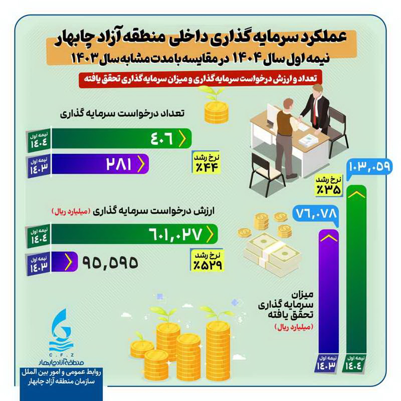 به گزارش گویای خبر به نقل از روابط عمومی سازمان منطقه آزاد چابهار، محمدسعید اربابی در گفت‌وگو با خبرنگار ایرنا اظهار کرد: بر اساس آمارهای رسمی، در نیمه نخست سال جاری ۴۰۶ درخواست سرمایه‌گذاری در منطقه آزاد چابهار به ثبت رسیده است که در مقایسه با ۲۸۱ مورد در مدت مشابه سال ۱۴۰۳، رشد ۴۴ درصدی را نشان می‌دهد.