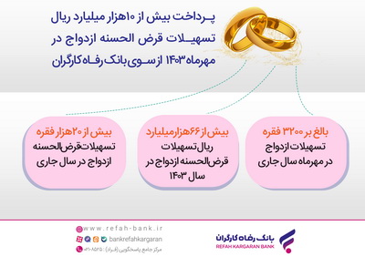 بانک رفاه کارگران در مهرماه سال جاری بیش از 10 هزار میلیارد ریال تسهیلات قرض‌الحسنه ازدواج و تهیه جهیزیه پرداخت کرده است.