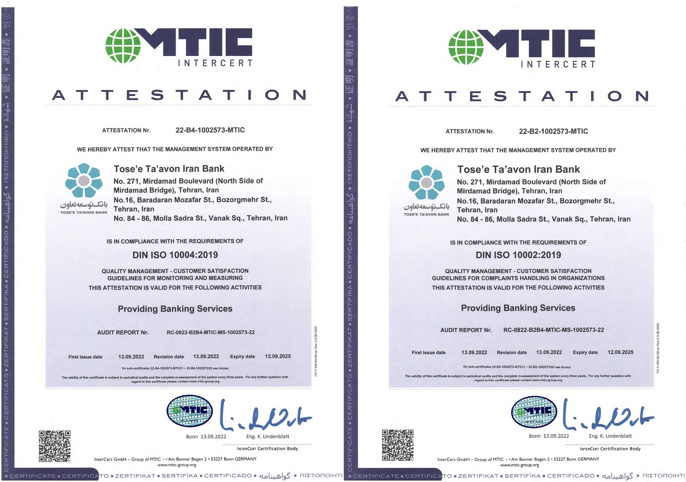 بانک توسعه تعاون برای دومین سال متوالی موفق به دریافت تاییدیه رعایت الزامات استانداردهای بینالمللی iso 10004:2019 & iso 10002:2019…