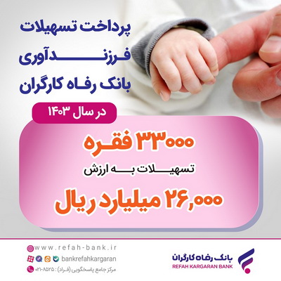 پرداخت بیش از 26 هزار میلیارد ریال تسهیلات قرضالحسنه فرزندآوری توسط بانک رفاه کارگران